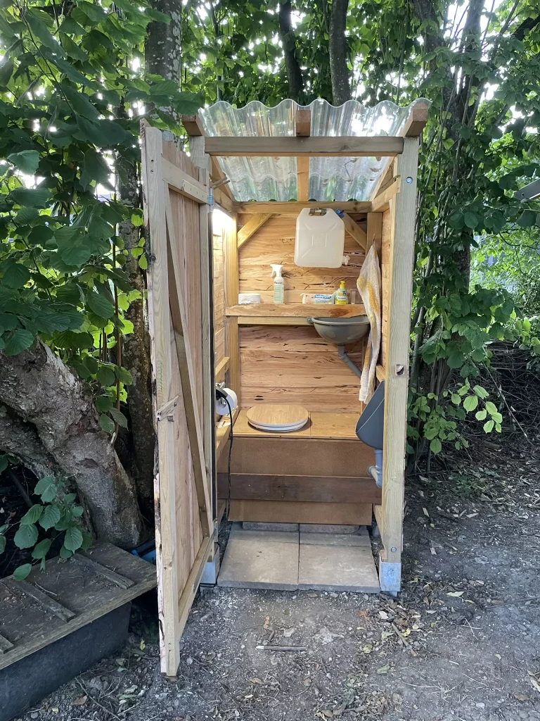 Eine Trockentoilette mit Waschbecken, sowie ein Stromanschluß sind ebenfalls vorhanden.