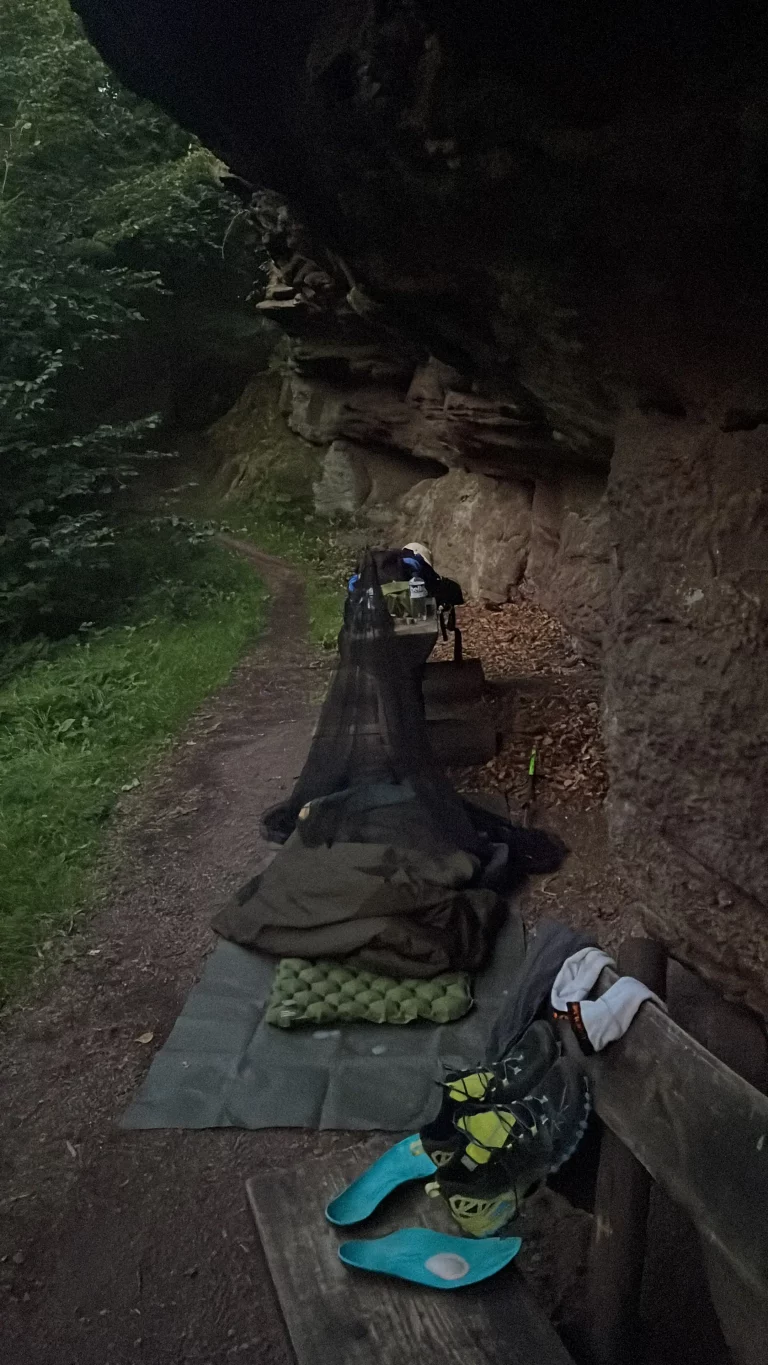 Das Tagesziel ist die Rennsteiggrotte unterhalb des Wachsteins. Dort komme ich nach 17km bei Dunkelheit gegen 20:30Uhr an. Das Nachtlager ist schnell aufgebaut und nach einem schnellen Vesper lege ich mich zur Ruhe.