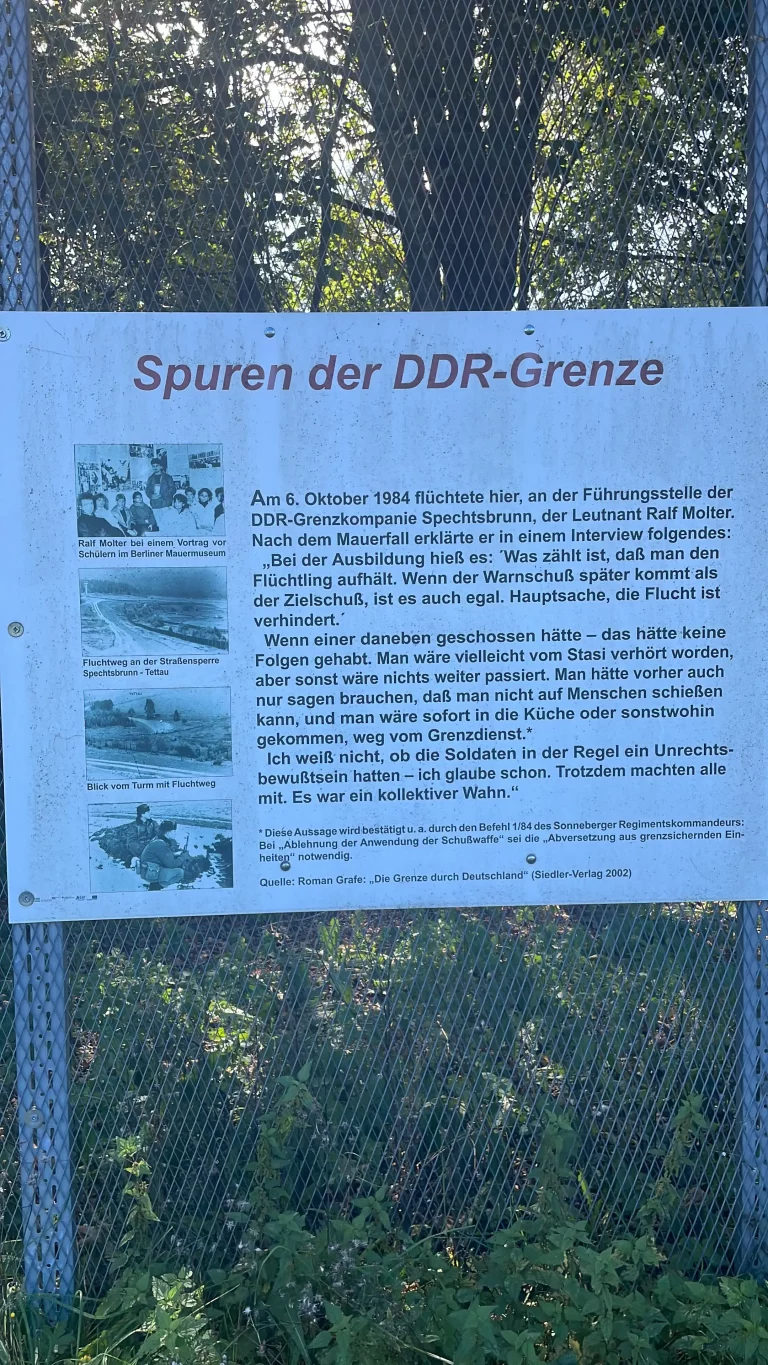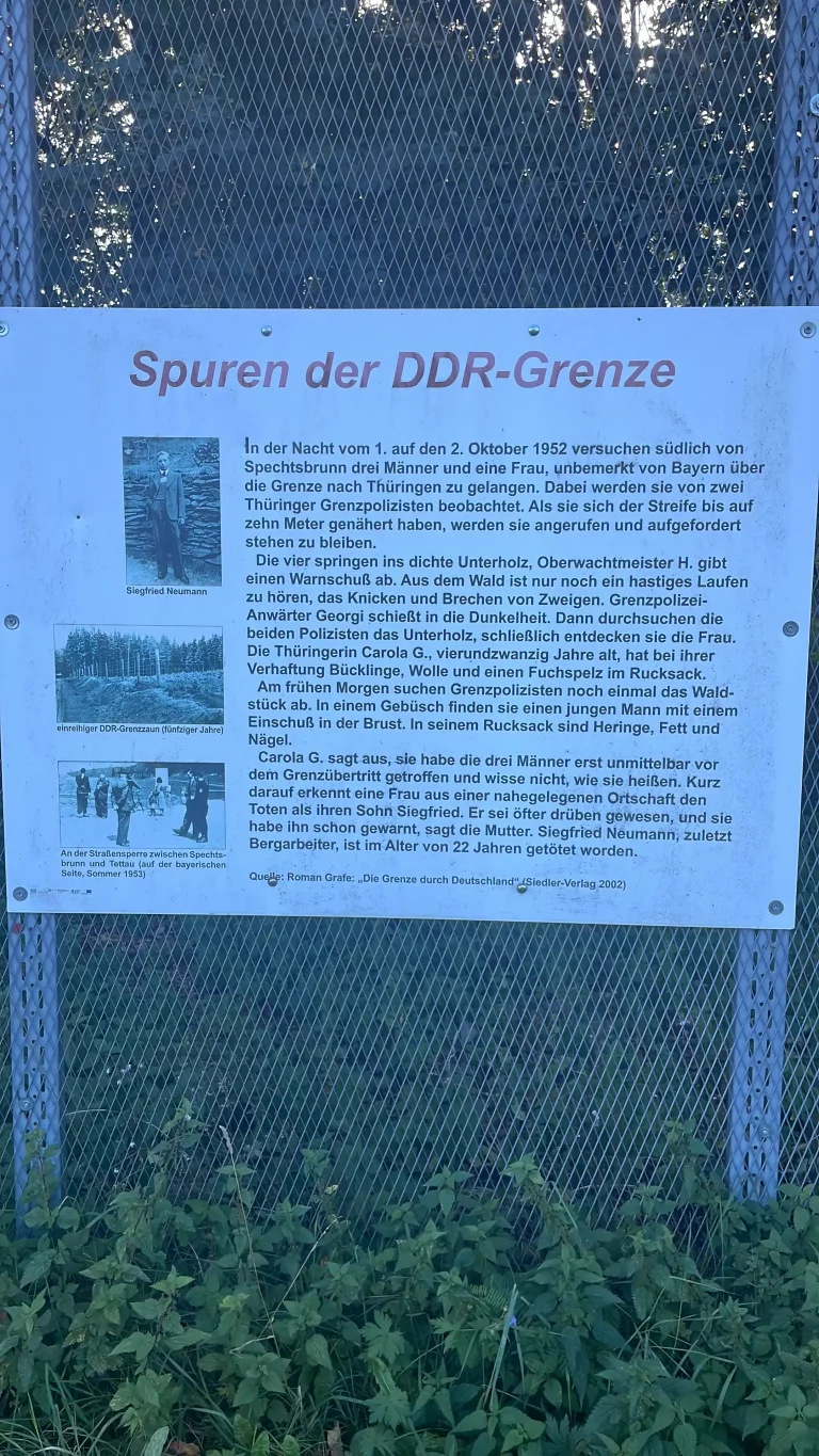 Bei Spechtsbrunn am Informationszentrum – 1.2km vor der Bayerischen Grenze – gibt es zwei Gedenktafeln zur ehemaligen Grenze zur DDR und den damaligen Fluchtversuchen an dieser Stelle.